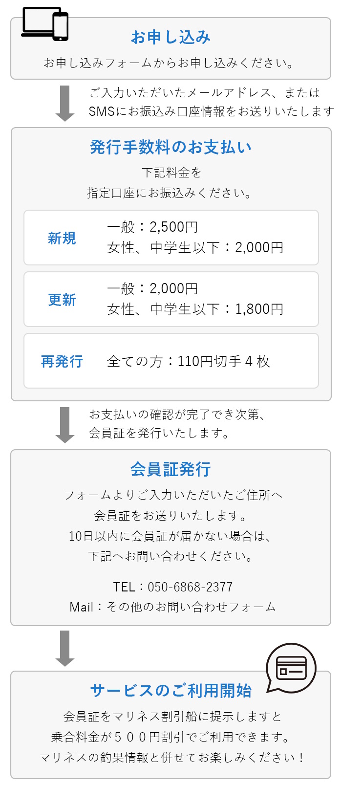 マリネス割引船は任意に辞退することもありますので、予めご了承下さい。 - 会員証をマリネス割引船に提示しますと乗合料金が500円割引でご利用頂けます。(事前予約必須。一部対象外有)
